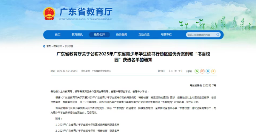 作为省级 “书香校园”,韶关市第十四中学秉持 “美凝心,美育人” 理念,构建了全方位的阅读育人体系。学校通过优化图书馆、班级阅读角、校园文化走廊等空间,打造沉浸式阅读环境,让书香浸润校园每个角落。同时,常态化开展 “经典诵读大赛”“亲子共读”“寒暑期阅读打卡”“我是风度书房小主讲” 等特色活动,激发师生阅读热情,形成全员参与的阅读氛围。在教学融合方面,学校以国家中小学智慧教育平台为核心,整合线上线下资源开发整本书阅读校本课程,其案例《巧用国家中小学智慧平台助力语文整本书阅读教学》入选省级优秀案例并在全省推广,展现了阅读与信息化融合的创新探索。此外,学校积极联动家校社资源,参与 “亲子共读迎丰收”“南国书香节” 等区域阅读活动,推动阅读文化向社会延伸。