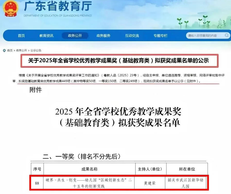 近日,韶关市武江区教育领域传来两大捷报:韶关市第十四中学成功获评 2025 年广东省 “书香校园”,武江区新华幼儿园的教育教学成果《破界・共生・创变 —— 幼儿园 “区域创新生态” 二十五年的创新实践》荣获全省学校优秀教学成果奖(基础教育类)一等奖,成为全市唯一获此殊荣的基础教育类项目。两项省级荣誉的背后,是武江区深耕教育内涵建设、推动各学段高质量发展的生动实践。
