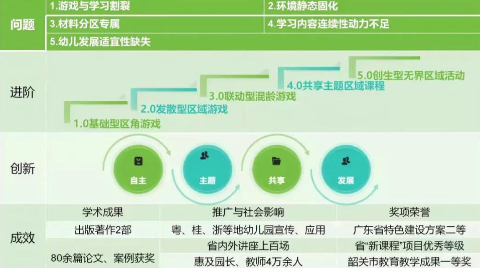 新华幼儿园的获奖成果则彰显了武江区学前教育改革的深度与温度。该成果立足 “以幼儿为本” 理念,针对幼儿园区域活动中 “游戏与学习割裂”“环境静态固化” 等核心问题,历经二十五年持续探索,构建了以 “自主、主题、共享、发展” 为核心理念的 “区域创新生态” 模式,实现了从 “基础型区角游戏” 到 “创生型无界区域活动” 的五阶跃迁。通过打破游戏与课程边界、建立 “三体共评” 智慧评价系统和家园社协同共育机制,不仅促进了幼儿个性化发展和教师专业成长,更形成了可复制、可推广的实践经验。截至目前,该模式已辐射粤、桂、浙等地幼儿园,累计惠及园长、教师 4 万余人次,相关研究产出 2 部著作、80 余篇获奖论文,举办省内外讲座上百场,荣获多项省市级荣誉,成为区域学前教育改革的先行典范。