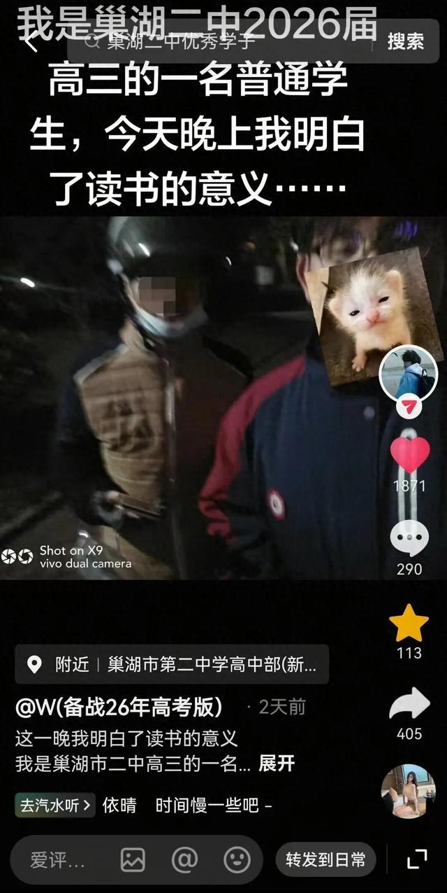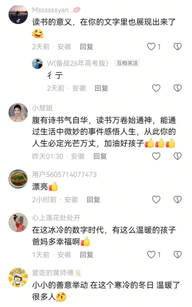 这条满含真情的视频,很快在短视频平台上引发热议。网友“爱吃的黄师傅”留言:“小小的善意举动,在这个寒冷的冬日,温暖了很多人。”有网友感慨:“优秀!成人比成才更重要。”还有一位在外地上大学、兼职送外卖的巢湖籍网友说:“兄弟你这个做法封神了,这个赞你有了。”